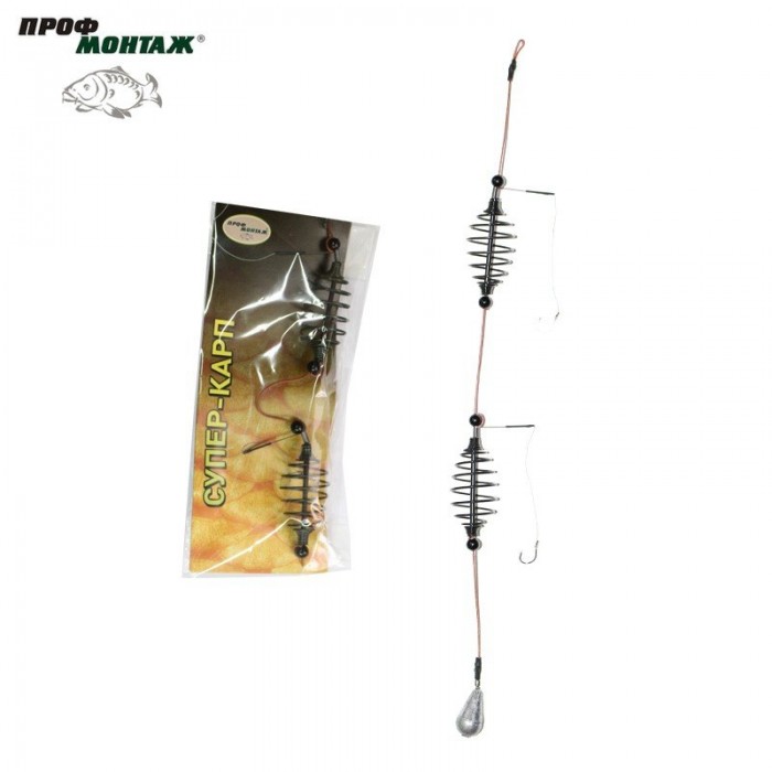Оснащення від торгової марки Профмонтаж вже давно завоювали популярність в українських рибалок, оскільки вони виготовлені з якісних матеріалів людьми, які розуміються на риболовлі. Донна коропова снасть Профмонтаж Супер Карп не стала винятком. Снасть являє собою дві пружинні годівниці, рознесені на відстань близько 6 сантиметрів, кожна з пружин оснащена гачком на бічному відводі. Довжина повідця близько 2 сантиметрів. Завдяки наявності двох годівниць, ви можете використовувати, наприклад, різні каші, щоб збільшити шанси клювання. Снасть розроблена для лову коропа, проте у прилові часто зустрічаються й інші види мирних донних риб, наприклад, карась та білий амур.