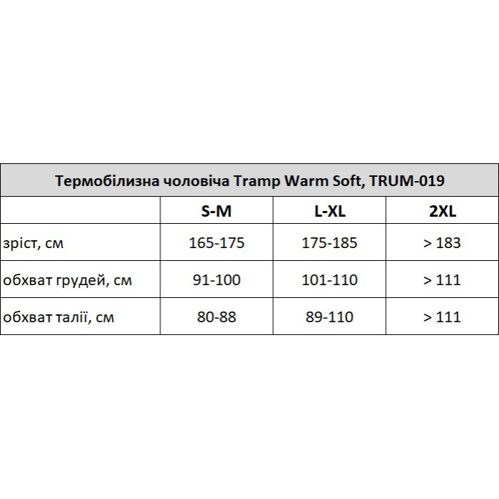 Термобілизна Tramp Warm Soft призначена для використання під час риболовлі, полювання, занять спортом та активного відпочинку в холодну погоду. Модель призначена для низьких та середніх фізичних навантажень, повсякденного носіння в місті, для людей які працюють на свіжому повітрі або в неопалюваних приміщеннях і транспорті, для прогулянок та відпочинку після катання на зимових курортах, при низьких та дуже низьких температурах. Модель є проміжним шаром, може носитися, як з першим (вологовідводячим) шаром термобілизни, так і самостійно. Завдяки матеріалу Warm Stretch білизна ефективно зберігає тепло, ізолює від холода і відводить зайву вологу від поверхні тіла. Підвищена еластичність тканини Warm Stretch та спортивний крій забезпечує повну свободу руху.