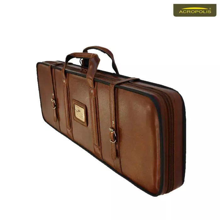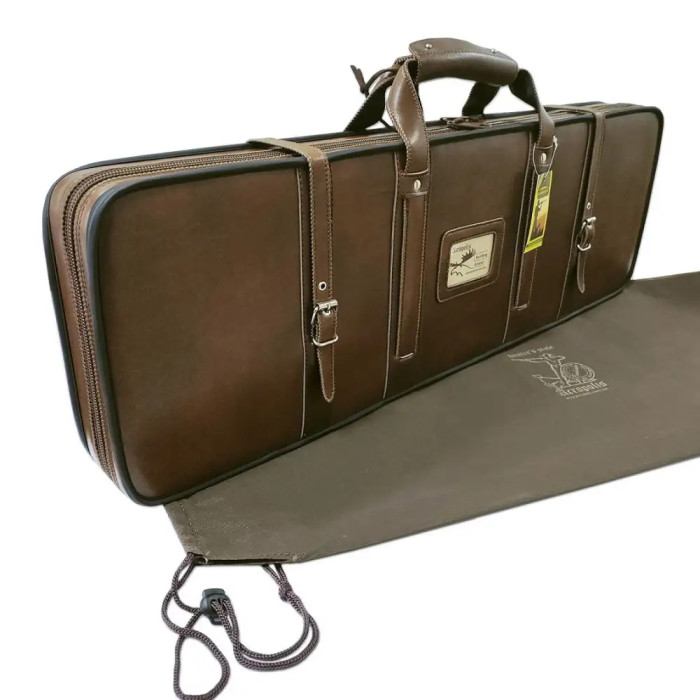 Повністю жорсткий футляр на фанерній основі для гладкоствольної зброї оснащений ручкою для зручного перенесення. Жорсткі перегородки всередині футляру формують відділення для ствола, прикладу, набору для чищення, ременя та дрібних аксесуарів. Для надійної фіксації елементів зброї в комплект додаються подушки. Ручки футляру з м’якою накладкою додатково прошиті та укріплені хольнітенами. Краї матеріалу зміцнені та захищені обметувальним швом. Пакувальні чохли в комплекті для ствола та прикладу. Футляр додатково закривається двома ременями з металевими пряжками. На передній стінці розміщена прозора кишеня з ПВХ плівки для ідентифікатора. Футляр комплектується пакувальним чохлом із нетканого матеріалу.