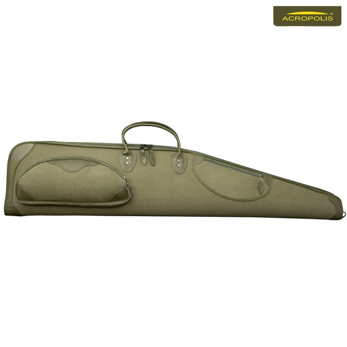 Футляр для гладкоствольної напівавтоматичної зброї, виготовлений з натурального брезенту, пластику, пінополіетилену. З середини - бережна велюрова підкладка. В комплекті з мисливським футляром є ремінь, який корегується по висоті для зручного перенесення виробу на плечі мисливця. Зверху нашиті кишені для аксесуарів. З боків - ручки з м’якою накладкою для транспортування. Кожна ручка футляру додатково прошита та укріплена хольнітеном. Накладки з натуральної шкіри додатково захищають краї футляру. Експлуатаційні особливості Акрополіс ФЗ-8/30: надійна фіксація зброї в зібраному вигляді, протиударність корпусу, виносливість до морозу, водовідштовхуючий матеріал.