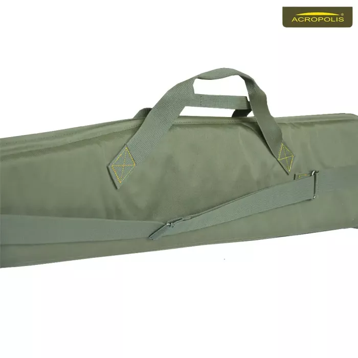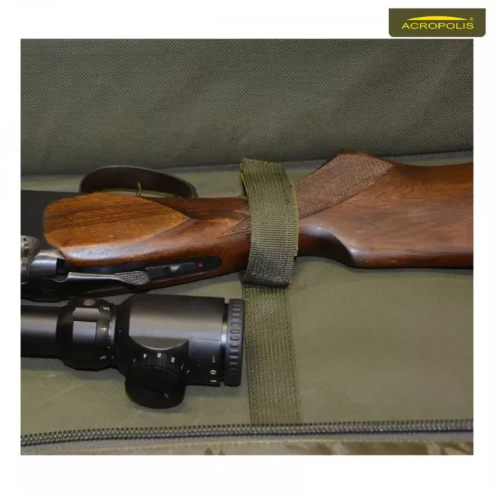 Футляр для нарізної зброї з оптичним прицілом Акрополіс СБ-7. Класичний дизайн в кольорі хакі. Зброя надійно фіксується текстильними стрічками з застібкою липучкою. Для транспортування передбачені дві ручкою та наплічний ремінь. Краї матеріалу укріплені обметувальним швом для тривалої експлуатації. Мисливський футляр Acropolis СБ-7б має 3-шарову конструкцію. Верхній шар - водовідштовхуючий. Легкий догляд за виробом за допомогою вологої ганчірки.