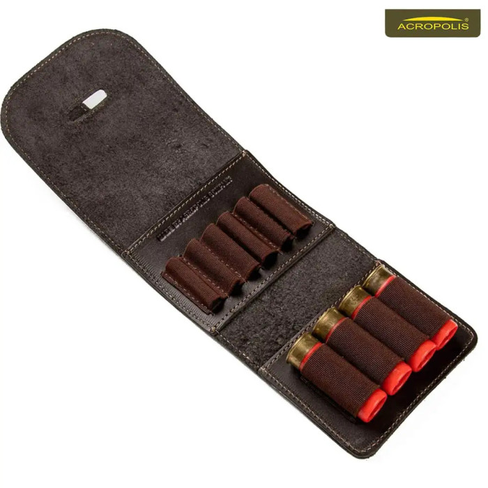 Акрополіс ФП-3 - це стильний шкіряний футляр комбінованого типу для патронів 12-16 та 30-06 калібру (4 та 6 штук відповідно). Має оригінальний дизайн. На розкладний кофр для патронів пришите шкіряне кріплення для ременя, а зверху на футлярі термотисненням зроблено два вишуканих малюнки на тему "мисливства".