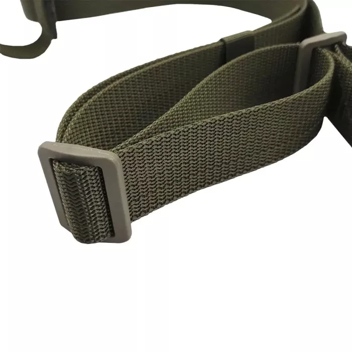 Ремінь зшитий армованою ниткою. Має значний запас по довжині та легко регулюється. Фіксується до АК з однієї сторони металевим карабіном до антабки, а з іншої - текстильним кріпленням до прикладу. В передній частині вшитий великий фастекс, завдяки якому ремінь можна подовжити та миттєво привести зброю в бойове положення.