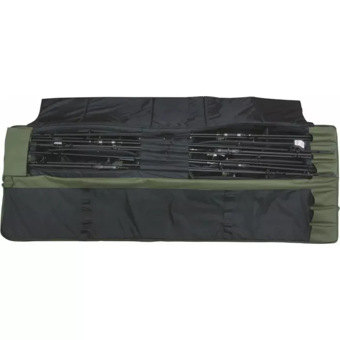 Чохол для 5 коропових вудилищ з котушками та 3-х вудочок без них. З однієї сторони перевозять 5 оснащених снастей, не розбираючи систему. Розробка враховує збільшене кільце і ніжку. Кожне вудилище має свою нішу для укладання та надійно фіксується за допомогою м'якої манжети з липучками та знімної перегородки. Для кращого захисту, укладені вудки з котушками зверху перекладаються м'яким килимком. По торцях кофр посилений пластиком. В середині додатково передбачена кишеня, яку можна заповнити стрижнями або трубою для створення ребр жорсткості.