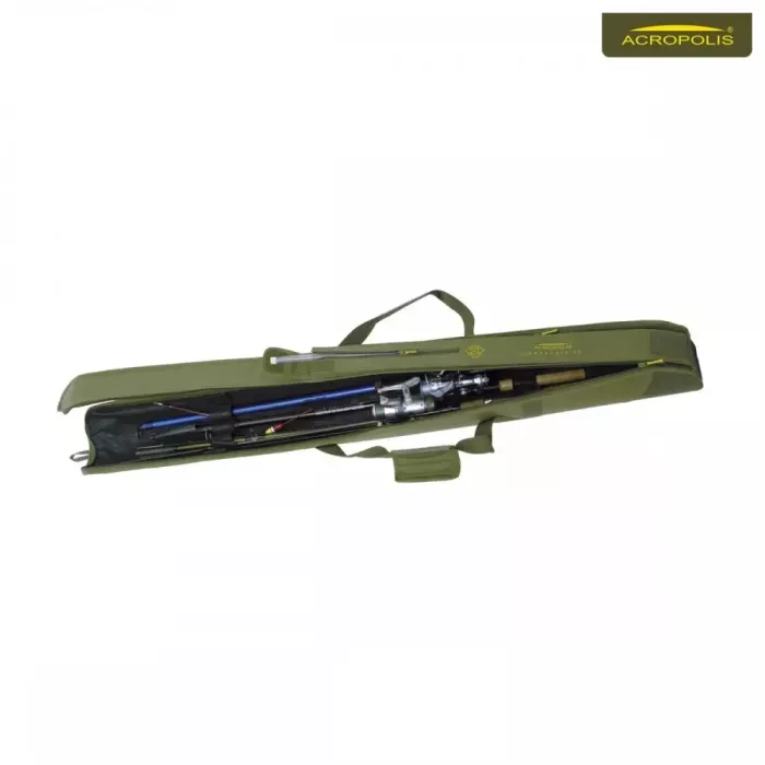 Жорсткий футляр на пластиковій основі для спінінгів Acropolis КВ-11 захищає від механічних пошкоджень. Великий внутрішній об'єм дозволяє розмістити достатню кількість спінінгів та вудочок з котушками, а також додаткові аксесуари. Наявні зовнішні кишені для аксесуарів. Переносні ручки та ремінь в наявності.