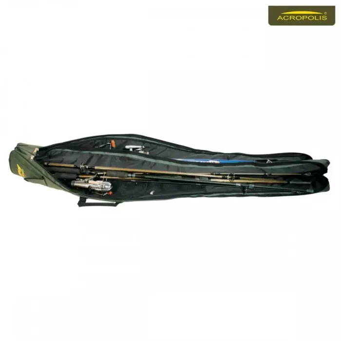 Кофр для вудилищ двосекційний Acropolis КВ-3а, м'який, з пінополіетиленом (поролоном) в стінках. Чохол розрахований на 2 вудочки з котушками і 2 снасті без котушок, має бічну кишеню для стійок і кишеню для дрібних аксесуарів. З боків пришиті ручки з міцної тканини для переносу в руках, та ремінь (з можливістю регулювання довжини) для транспортування рибальського чохла для вудилища. Надійний, якісний кофр Акрополіс вбереже ваші вудки довжиною до 160 см цілими та неушкодженими.