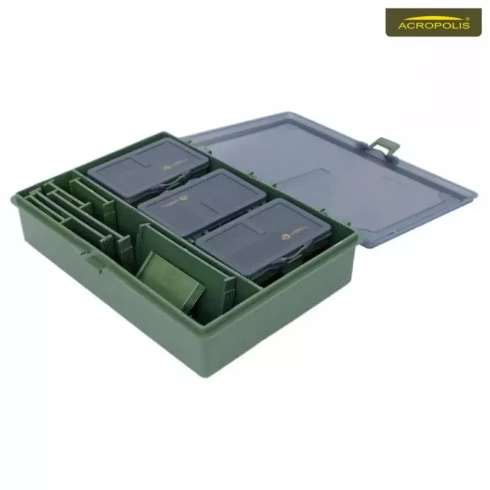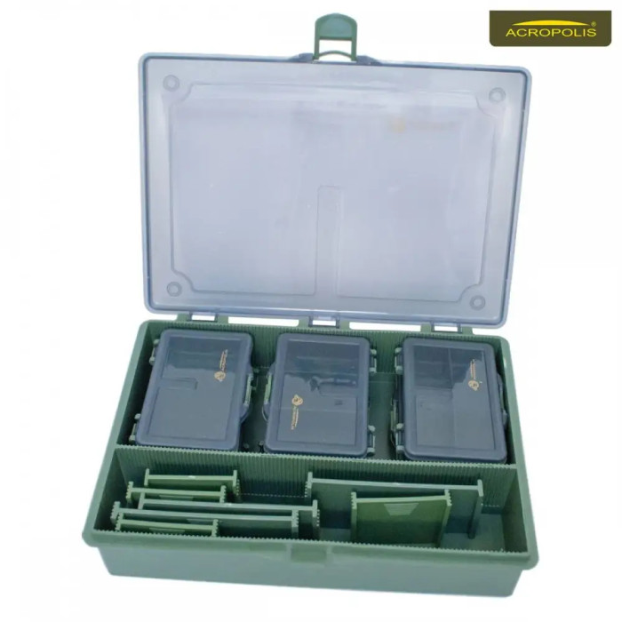 В комплекті з основною коробку іде 6 маленьких пластикових коробочок для воблерів, блесни, джига і мікроджига. Також рибаки часто складають сюди і силіконові приманки, адже коробки герметично закриваються і силікон не видихається та не висихає.