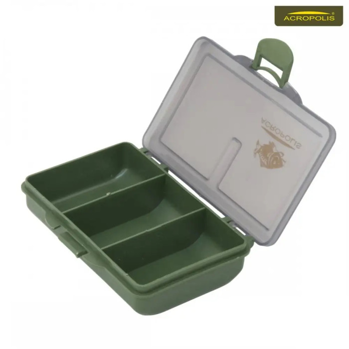 Рибальська пластикова коробка зеленого кольору Акрополіс МБ-3 на три статичних відділення. Зверху закривається прозорою кришкою на надійну застібку. Призначена для зберігання рибацьких крючків, грузил, невеличких поплавків та приманок тощо.