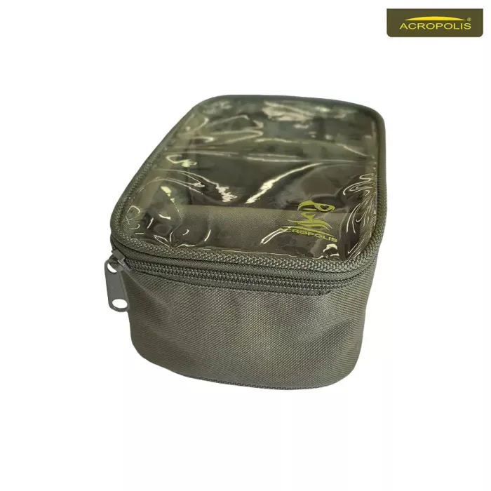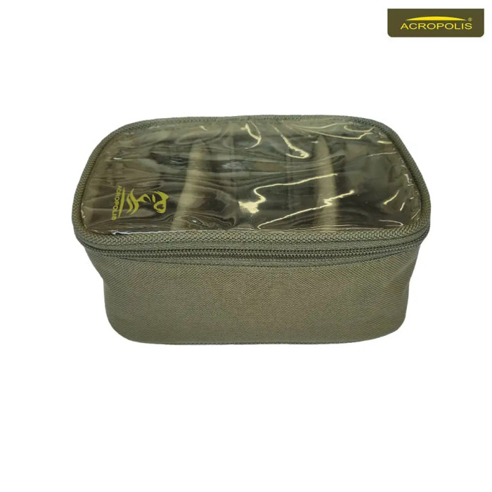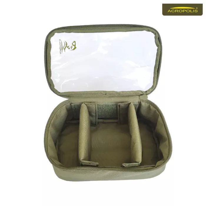 Органайзер для рибаків. Сумка з двома знімними перегородками для аксесуарів та снастей. Стінки ущільнені пінкою. Закривається на замок з двома бігунками. Верхній відкидний клапан виготовлений з міцної ПЕ-плівки, стійкої до ультрафіолетових променів. Дозволяє одразу побачити внутрішній вміст органайзера. Зовнішній матеріал стійкий до вологи та зносу – поліестер D600.