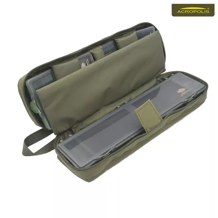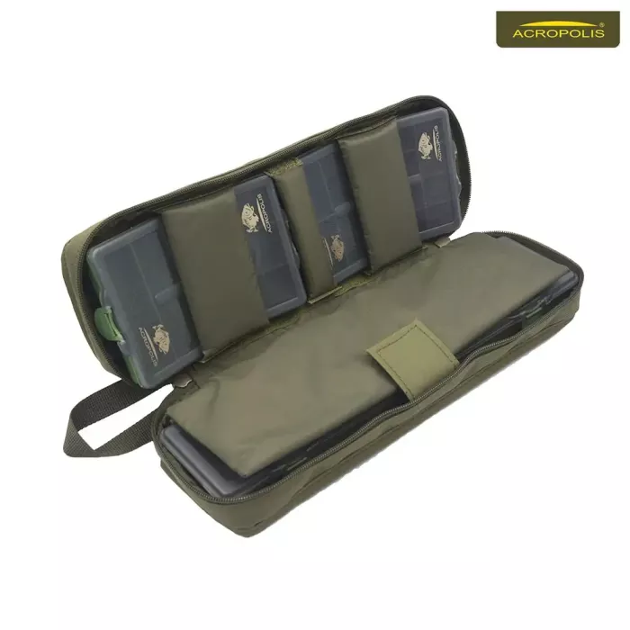 Рибацька сумка поводочниця Acropolis РСП-1 з комплектом пластикових коробок для зберігання повідків, гачків, вантажів та інших дрібних аксесуарів. Стінки сумки і внутрішні перегородки багатошарові, мають захист з пінополіетилену.