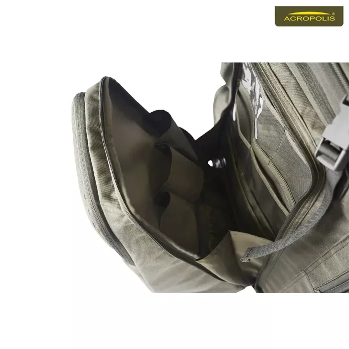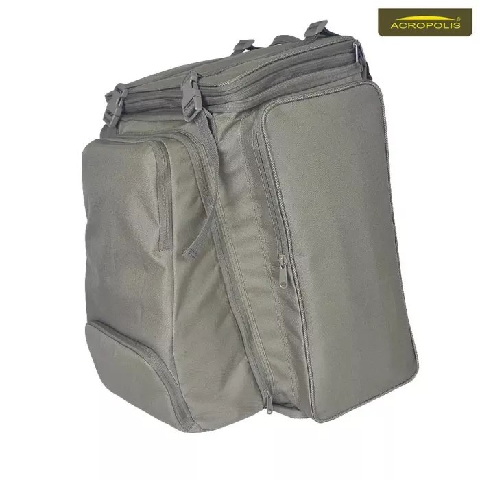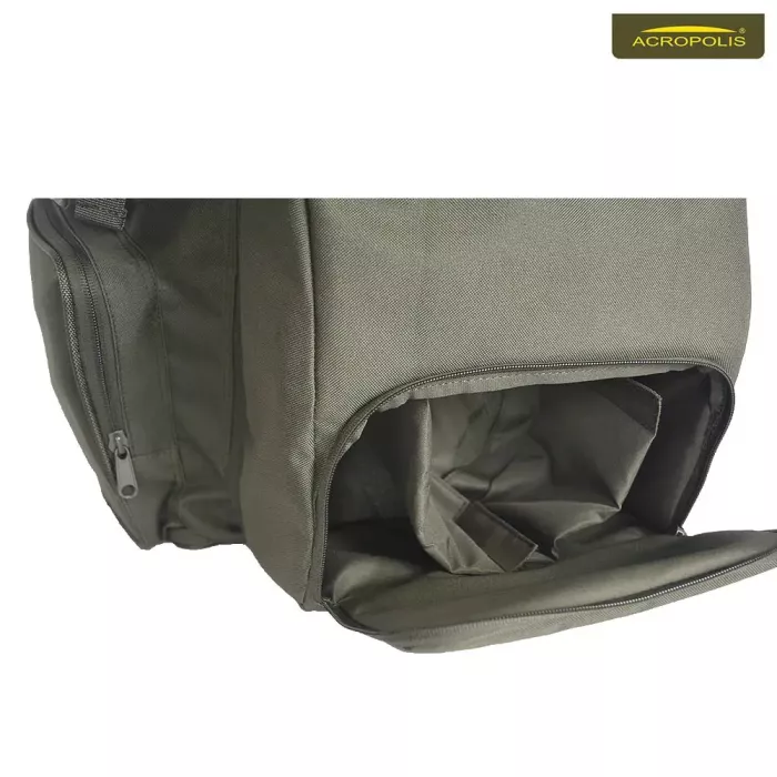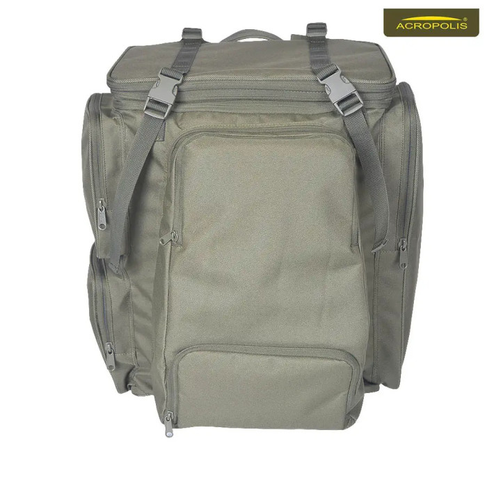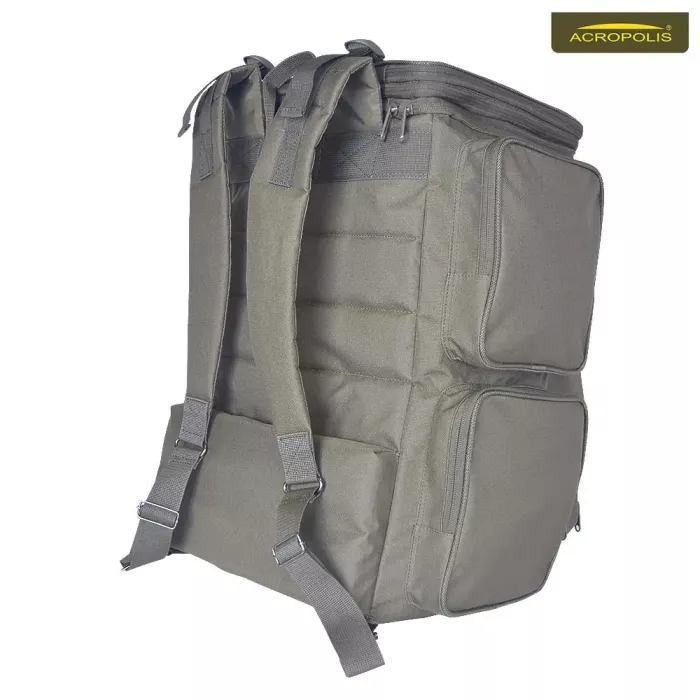 Продуманий дизайн – розроблений рибаками для рибалок. Має велике центральне відділення об’ємом 41л. та 8 допоміжних секцій, що дає можливість збільшити об’єм рибацького рюкзака РР-2 до 70л. Зовнішні кишені мають різний розмір, форму та призначення. З одного боку, дві квадратні кишені для невеликих рибацьких аксесуарів, з протилежної сторони – об’ємна кишеня на всю площину. Спереду рюкзака для рибалки бачимо 3 допоміжних відділення з ущільненими пінкою стінкам для кращого захисту вмісту від ударів чи інших механічних впливів. Знизу – відсік зі знімними перегородками. Сюди рибак може скласти рибальські котушки різних розмірів. Над ним відділення на замку для великої рибацької коробки для приманок, грузил, прикорму. Одразу за цим відділом бачимо основну додаткову секцію з великою кількістю невеликих кишень з ПВХ - плівки та тканини. Зокрема, на відкидній частині внизу більша кишеня на гумці, а вверху дві бічні – для невеличких пластикових коробок і центральне кріплення для фіксації в середині невеликої поводочниці, типу Акрополіс ПБ. З іншої сторони, 4 ряди кишень з плівки: в першому – 3, в другому – дві, в третьому і четвертому – одна більша кишеня. У верхній частині рюкзака для риболовлі Acropolis РР-2 за допомогою надійних замків – блискавок та текстильних строп з застібками «фастекс» схований ще один додатковий об’єм. Якщо потрібно спакувати більше речей, рибак може відстебнути всі замки і збільшити розмір рюкзака для риболовлі. Висота риболовного наплічника виросте на 10 см. На спинці пришиті 2 регульовані плечові лямки, ручка для переносу та об’ємна м’яка вставка на рівні поясу для комфортного перенесення наплічника на спині рибалки. Дана вкладка застібається на липучку, за бажанням сюди можна скласти дощовик. Рюкзак рибацький РР-2 дуже місткий і практичний.