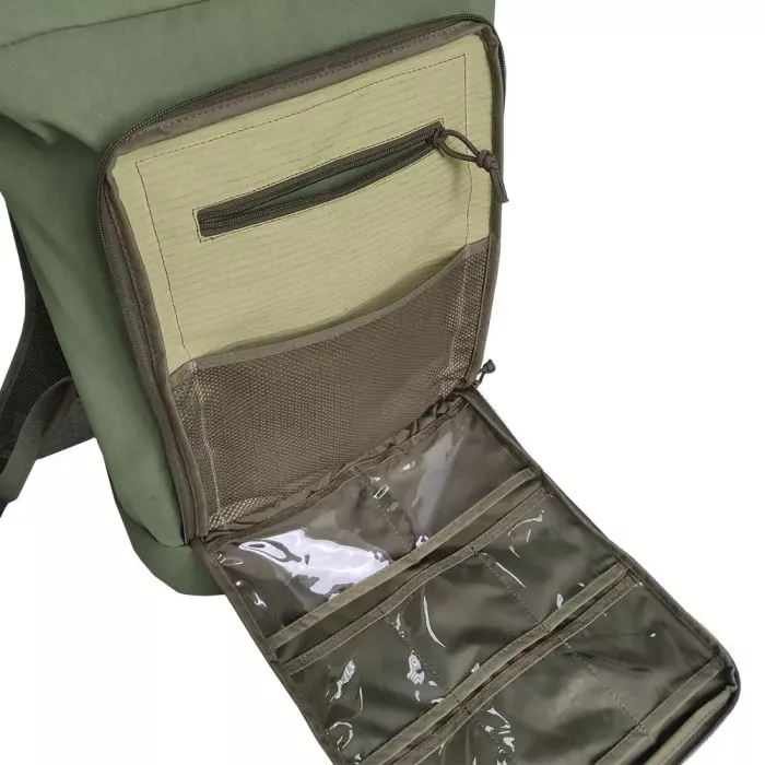 Простора центральна секція (об’єм - 20л) оснащена відділенням під велику рибальську коробку (модель КУ) , з протилежної сторони має допоміжну кишеньку на замочку, а збоку спеціальний відсік для пляшки з водою до 1,5л. Об’єм цієї секції можна збільшити до 22,5л., повністю випроставши верхню її частину.