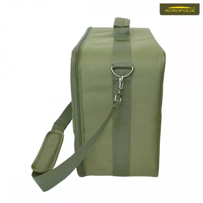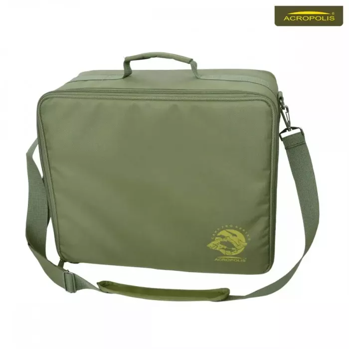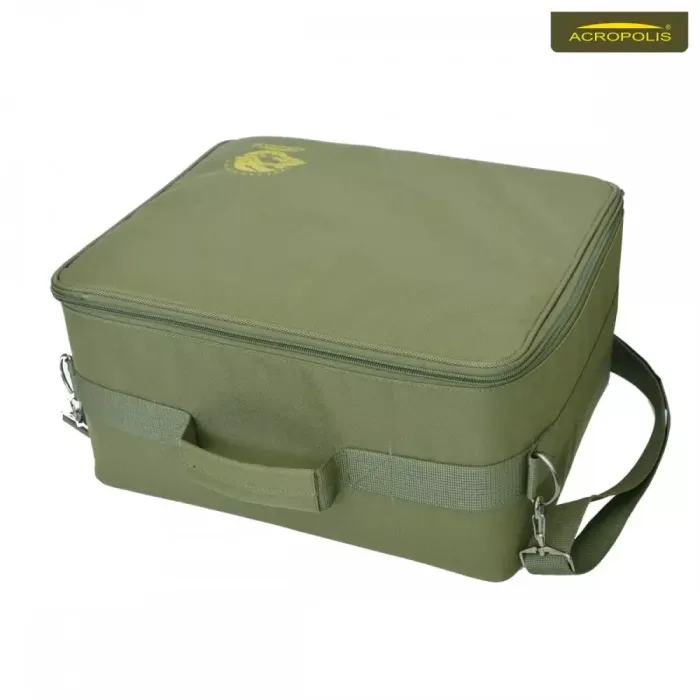 Термосумка для зберігання і транспортування дипів і атрактантів Акрополіс - СД-1н. Укомплектована двома напівжорсткими знімними модулями. Збоків та через дно виробу ззовні проходить міцна текстильна тасьма для укріплення каркасу. До неї надійно пришиті ручки для переносу. Зовнішня кришка сумки закривається на надійний замок-блискавку. За бажанням, сумку рибальську Acropolis СД-1н можна використовувати, як невеличку термо-сумку для напоїв та їжі під час відпочинку на природі, пікніку чи прогулянки в ліс.