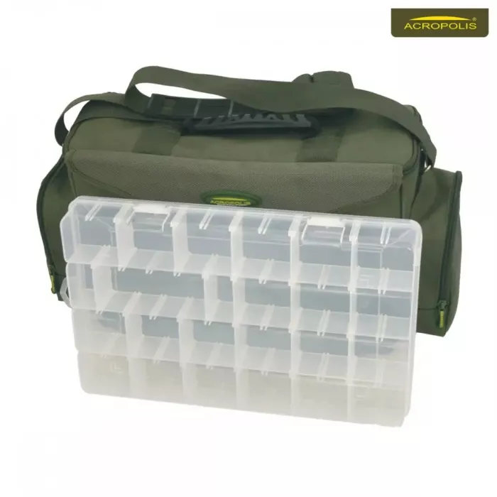 Сумка риболовна Акрополіс РС-4у в комплекті з прозорою пластиковою коробкою для спінінгіста. Виконана в захисному зеленому кольорі, який не притягує сонечне проміння та не вигорає на сонці. Конструкція виробу достатньо міцна. Сумка надійно носиться і не нищиться під великою вагою. Передня кишеня достатньо тверда, щоб надійно захистити котушки з шпулями. В середину можна помістити дві рибацькі коробки під аксесуари. По боках кріпиться ремінь для переносу виробу на плечі. В руках сумку можна нести за верхню об'ємну ручку.