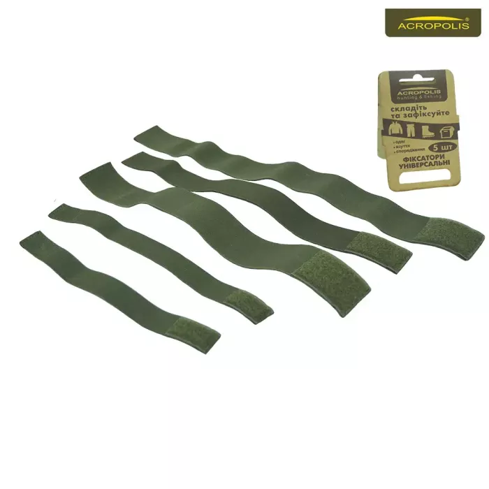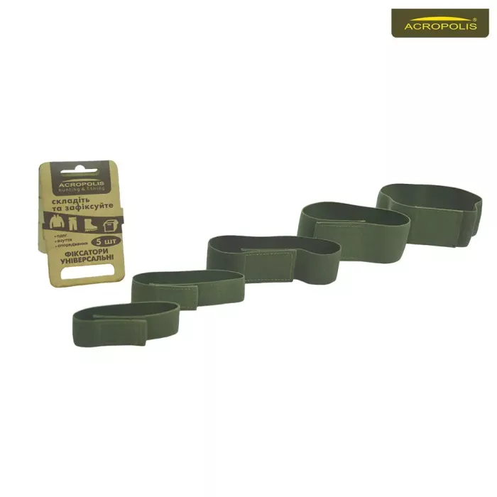 Комплект гумок - фіксаторів для речей, виконаних з міцної еластичної стрічки для стяжки одягу, взуття, спорядження, підвішування речей, сумок та чохлів під час відпочинку на природі, туристичного походу чи поїздки, риболовлі та полювання, пікніку і кемпінгу. В комплект входить 5 стрічок з текстильними застібками липучками. Гумки в фірмовому оливковому кольорі різні по довжині та ширині, а саме: 50х5см; 40х5см; 40х4см; 30х2,5см; 25х2,5см. Практичні текстильні стрічки: для стяжки спорядження (дозволяють компактно скласти його в сумці, рюкзаку чи багажнику автомобіля); можуть замінити карабін для підвішування нетяжких речей; можна використати, як гумку для фіксації коробок, контейнерів тощо.