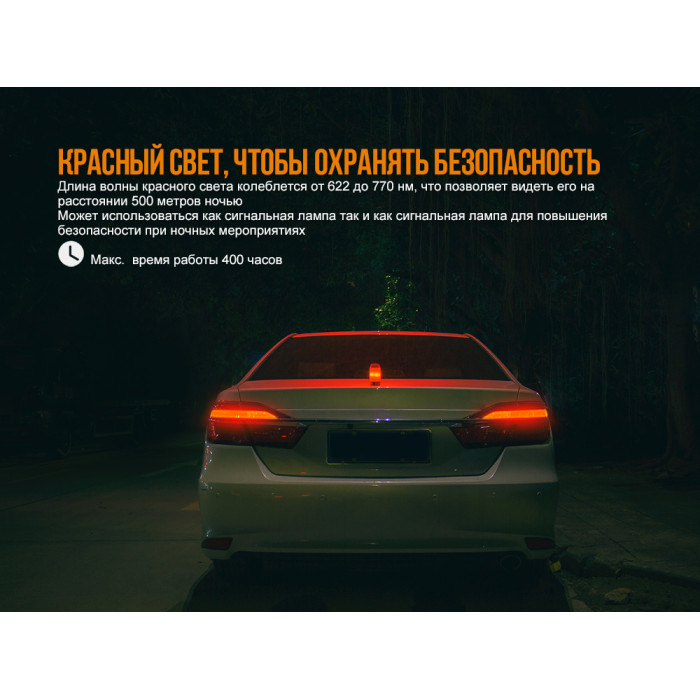 - Червоні спалахи: режим миготливого червоного освітлення, в якому ліхтар світить з яскравістю 1 люмен і працює протягом 400 годин.