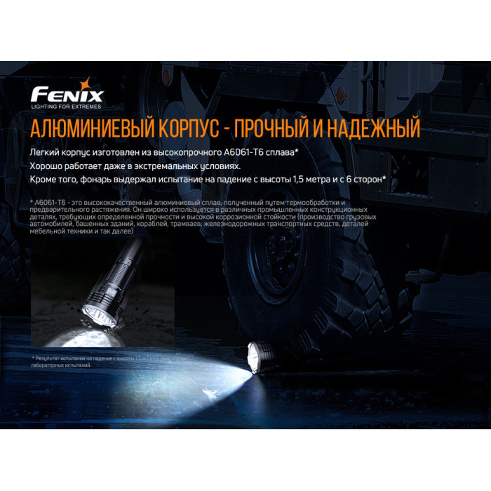 Fenix LR50R характеризується дивовижною яскравістю в 12 тисяч люменів. Відстань дії променя сягає 950 метрів. Подібних можливостей вистачить для здійснення пошуково-рятувальних операцій. Будь-який об'єкт в умовах темряви ви легко виявите за допомогою цього приладу. Fenix LR50R має подвійні бічні перемикачі з нержавіючої сталі. Вони дозволяють без зволікання активувати і перемикати шість загальних рівнів яскравості, а також функціональні режими, такі як: миттєвий Турбо, Стробоскоп і SOS.