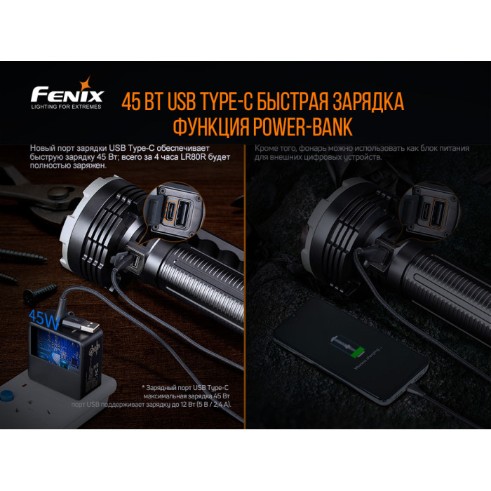 Ліхтар моделі Fenix LR80R являє собою дуже яскравий, компактний прилад для здійснення пошукових операцій. Його найбільший світловий потік досягає 18 тисяч люменів, при цьому далекобійність променя – понад кілометр. Прекрасні можливості для практичних завдань. Функціонує такий потужний ліхтар на акумуляторі 7,2 V/12000mah Li-ion, який вбудований прямо в корпусі моделі. Акумулятор відрізняється досить великою продуктивністю, і без зарядки ліхтар здатний світити протягом 25 днів. Це допомагає виконувати завдання, що вимагають великої ефективності.