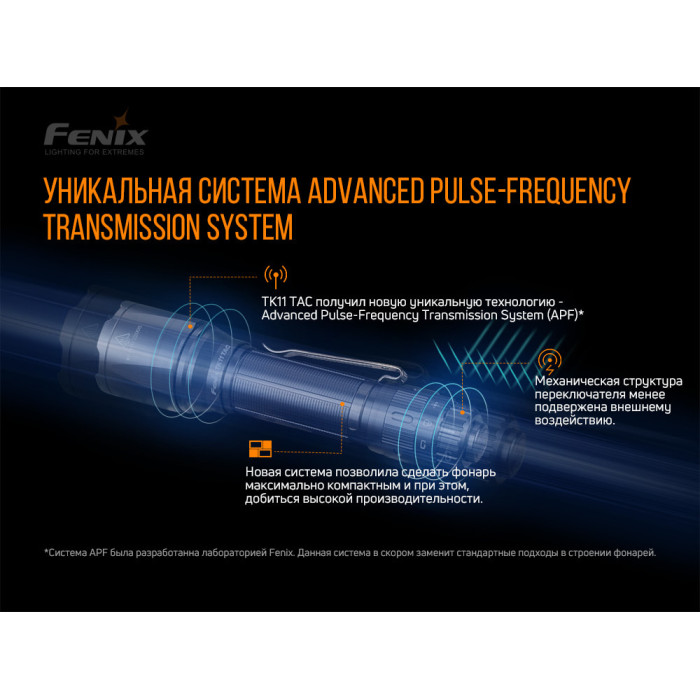 Фірма Fenix представила модель TK11 TAC, яка є покращеною версією вже відомого ліхтаря TK11. Прилад залишається все таким же малогабаритним, однак, він відрізняється куди кращим тактичним розгортанням. Дану модель розробники забезпечили багатьма перевагами. Так, вона отримала унікальну систему APF (Advanced Pulse-Frequency Transmission). Система сформувала компактний корпус виробу в один шар для передачі інструкцій, і більш сильний захист від перешкод механічного перемикача.