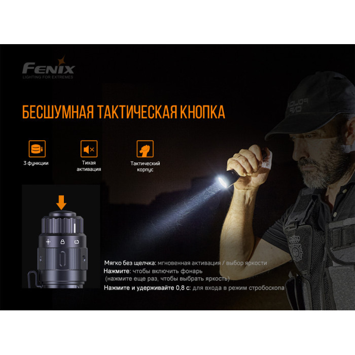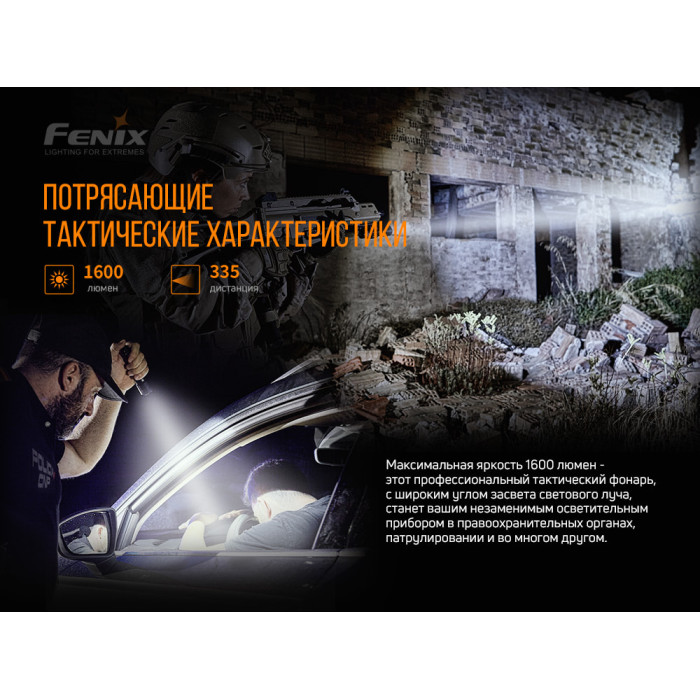 Найбільша можлива яскравість – 1600 люменів, а відстань дії променя становить 335 метрів. Передбачені Тактичні і Чергові режими. Крім того, є запатентований двофункційний тактичний перемикач для швидкої тактичної активації. Вибирати режим можна однією рукою, в кожному режимі присутня опція блокування.