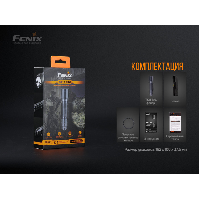 Модель ліхтаря Fenix TK11 TAC, чохол, запасне кільце для ущільнення стиків корпусу, талон гарантії, керівництво до застосування.