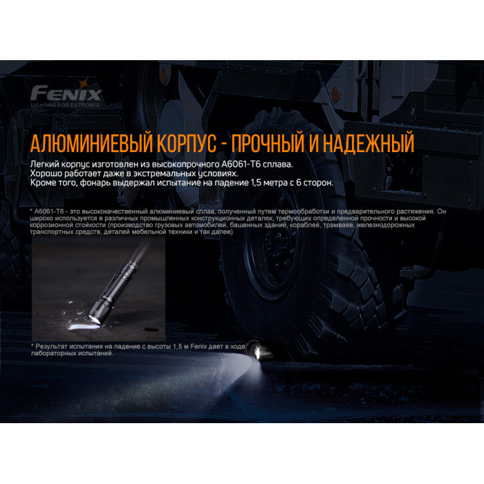 Габарити моделі складають 140*34*23,5 мм. Вага 114 г, не враховуючи батарейки. Корпус у цього ліхтаря досить міцний, в основі – сплав алюмінію А6061-Т6. Даний матеріал часто використовують у промисловості, оскільки він має привабливи властивості. Міцний, стійкий до зношування і надійний. Модель витримує падіння з висоти одного метра, зберігаючи цілісність та працездатність. Також може занурюватися під воду, працюючи там так само ефективно, як і на суші. Стандарт захисту від пилу і вологи: IP 68. Корпус має покриття, надміцне анодування. Стійкість до абразивних впливів.
