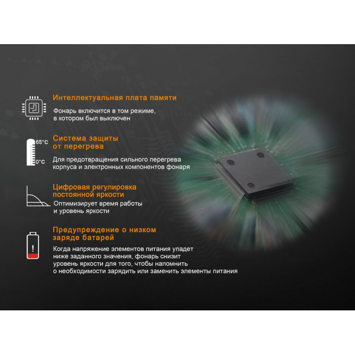 Щоб вам було зручніше, кожен рівень яскравості вноситься в пам'ять ліхтаря, щоб його не довелося довго шукати при наступному включенні Fenix TK25 UV. Також ліхтар завжди вчасно попередить свого власника про необхідність замінити елементи живлення, адже в нього вбудований спеціальний індикатор. Якщо енергії в акумуляторі вже недостатньо для підтримки роботи навіть самого економного режиму, діод почне блимати по три рази кожні п'ять хвилин, що і буде сигналом для заміни елемента живлення.