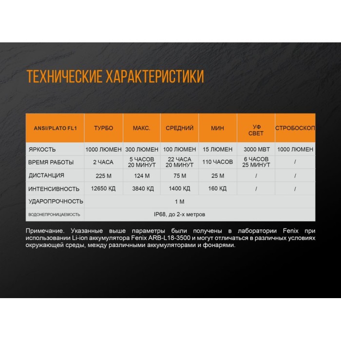 Всі робочі характеристики TK25 UV ретельно тестувалися у виробничих лабораторіях компанії. На підставі результатів цих тестів, зазначені робочі параметри для всіх режимів освітлення. Ці дані будуть справедливі за умови використання акумулятора ARB-L-18-3500 виробництва Fenix.