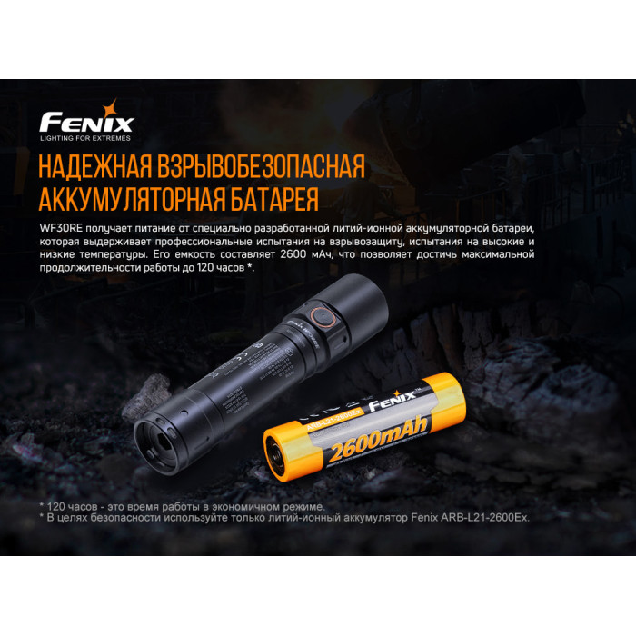 Модель Fenix WF30RE є вибухозахищеним варіантом ліхтаря, використовувати який оптимально скрізь, де існує загроза вибуху. Виняток становлять підземні шахти. Ліхтар протестували, і він отримав сертифікати IECEx, ATEX, CSA, NEPSI. Призначений для застосування в зоні 1 і зоні 2, де газова суміш відноситься до класифікації IIA, IIB і IIC. Також надасть користь в місцях з горючим пилом. Це можуть бути Зона 21 і Зона 22, а конкретніше: заправні станції, хімічні та текстильні підприємства, пожежні частини, металургійні заводи та інші.