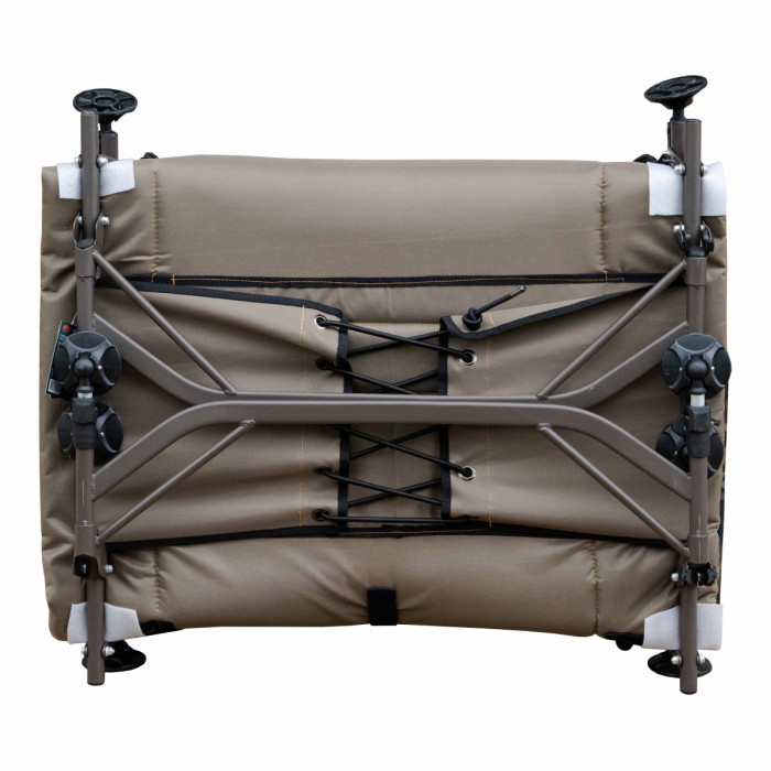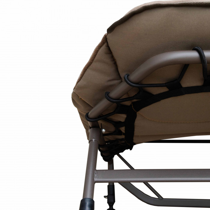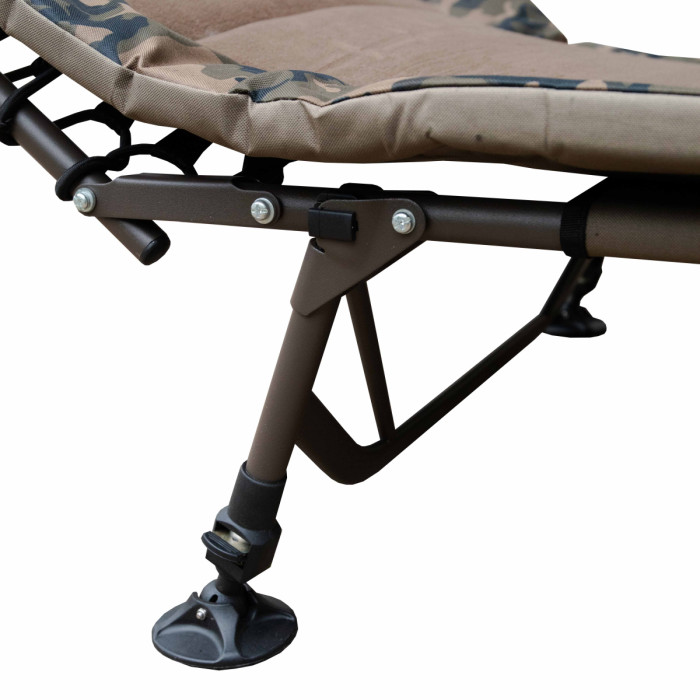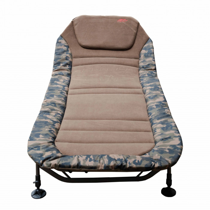 Широка та зручна розкладачка на надійному стальному каркасі. Колір – камуфляж. Центральна частина виготовлена із м’якої флісової тканини, яка зберігає тепло. Чотири пари ніжок мають регулювання по висоті та мають збільшену площу контакту з поверхнею. Ця розкладачка стане гідною заміною комфортного домашнього ліжка в умовах, де його немає.