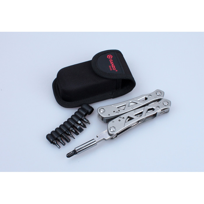 Multi Tool Ganzo G112 - це зручний у всіх відносинах багатофункціональний інструмент. Він повністю нержавіючий, що важливо для використання за містом. Всі інструменти продумані до найдрібніших деталей. Вони міцні, ефективні у виконанні свого завдання, не схильні до корозії. У порожніх зсередини рукоятках мультитула розташовуються відкривачка для консервів і для пляшок, шило, два ножі: з гладкою і серрейторной заточкою, три різних за розміром і формою викрутки, лінійка. Крім того, мультитул легко перетворюється при відкритті обох ручок в повнорозмірні плоскогубці. Вони ж можуть виконувати роль кусачок. Інструмент обладнаний захватом для гайок.
