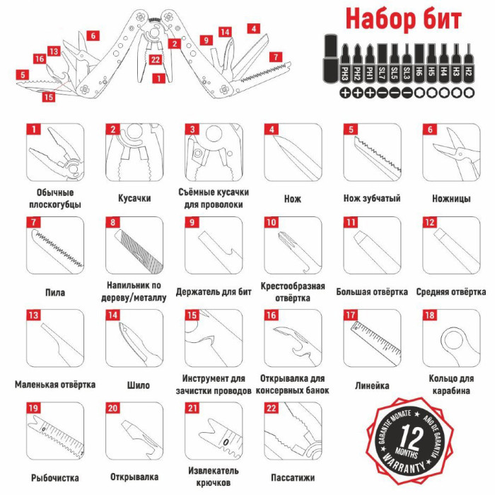 Зберігається мультитул в жорсткому нейлоновому чохлі, що застібається на кнопку. Там же, в окремій кишеньці, і розміщується набір біт.