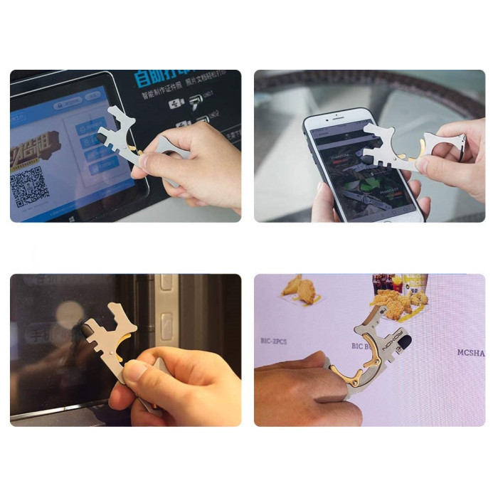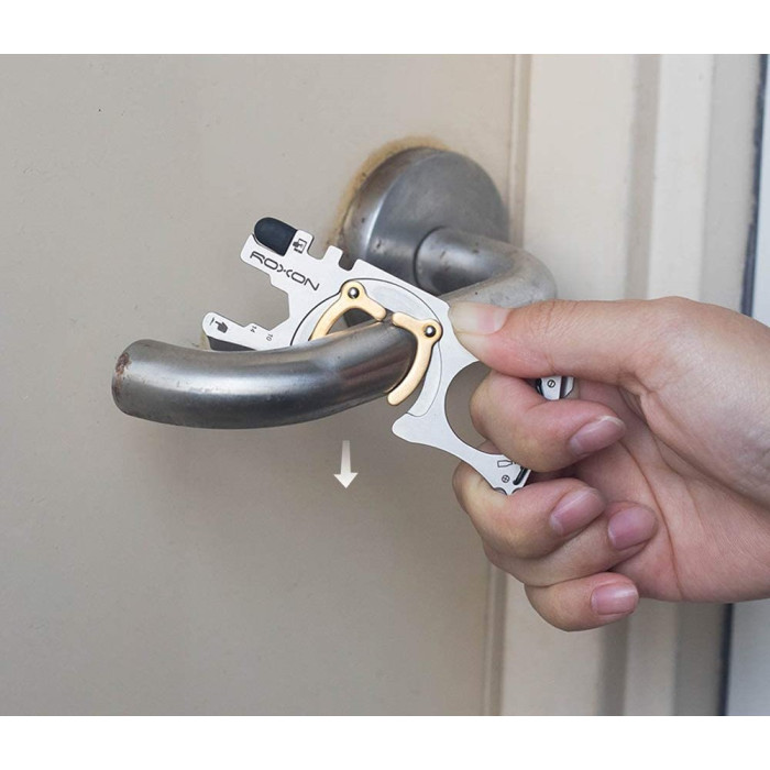 Дверний гачок виготовлений з натурального антибактеріального мідного матеріалу, дієвого проти бактерій і вірусів. Мультитул сприяє міцному захопленню та утриманню дверної ручки, без ковзання, забезпечуючи безпеку. Натисніть, щоб відкрити двері. Точно так само просто, не побоюючись бактерій, можна йти виносити сміття, йти в супермаркет і виконувати інші дії. Можна навіть натискати на кнопки ліфтів або користуватися банкоматом, – все це праці не складі. Словом, мульті інструмент Roxon Spirit S705 дозволяє легко виконувати всі ті, що ви зазвичай робите за допомогою пальців своїх рук. Альо при цьому – без ризику зараження.