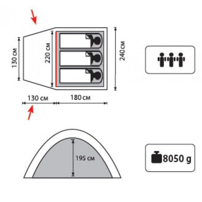 - Тент: 100% поліестер з покриттям Dry Tech, 3000 мм в. ст.