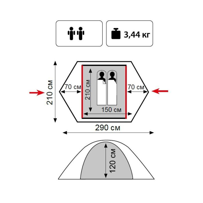 - Внутрішній намет: 100% дихаючий поліестер