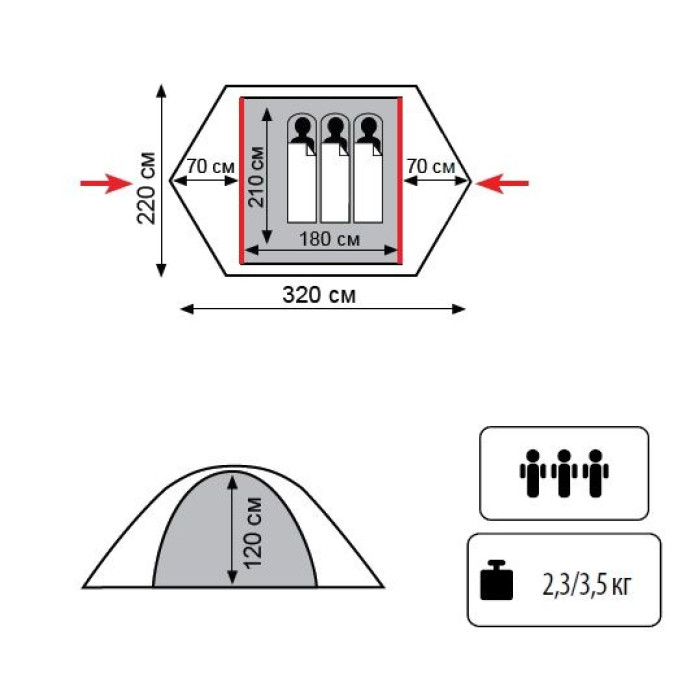 - Додаткова консольна дуга збільшує внутрішній об`єм намету, вітростійкість і розміри тамбурів