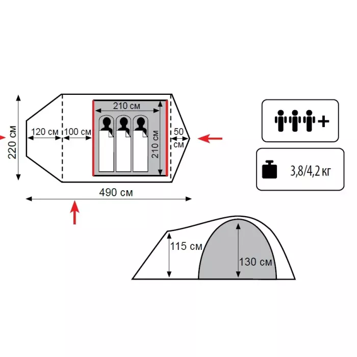 - Внутрішній намет: 100% дихаючий поліестер