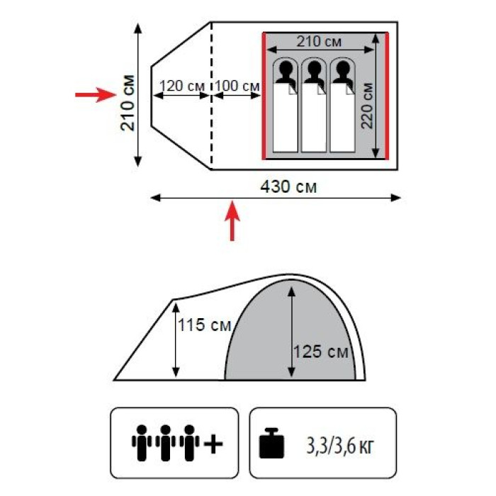 Універсальний тримісний намет Totem CARRIAGE 3. Тридугова модель конструкції напівсфера з просторим тамбуром збільшеної довжини і одним входом.