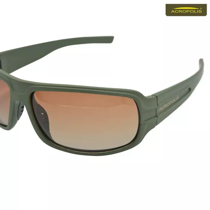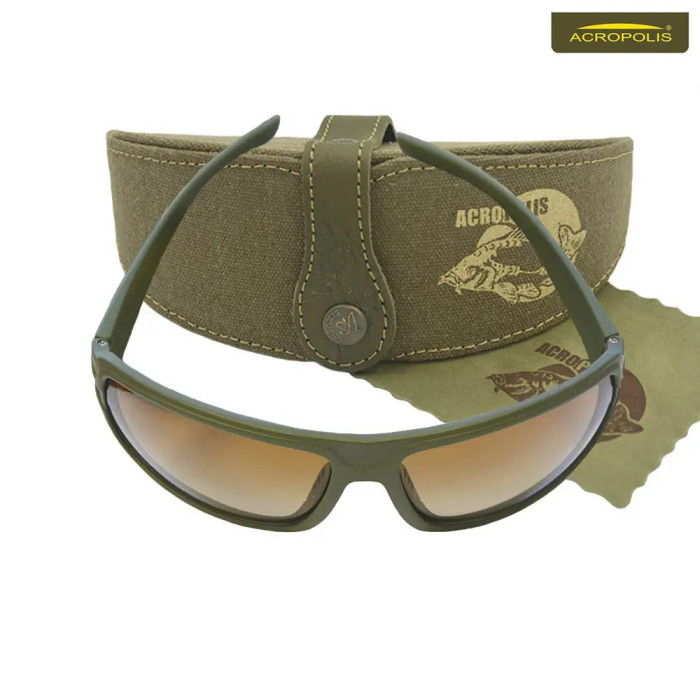 Чоловічі сонцезахисні окуляри, виконані в зеленій оправі для рибаків. Коричневі градієнтні лінзи добре відбивають бліки від води в сонячну погоду та зменшують навантаження на очі як за яскравого, так і приглушеного світла. Дещо підвищують контрастність кольорів та чіткість зору. Максимальний поляризаційний ефект досягається в прозорій мілкій водоймі. Їхня ефективність падає по мірі збільшення глибини. Крім того, окуляри не тонуть в воді. Легкий і стійкий до ударів матеріал оправ та лінз робить комфортним процес носіння. Комплект Acropolis ОФА-4р, крім поляризайіцних окулярів, складається також з жорсткого футляру з зовнішнім малюнком на тему рибалки та серветки з мікрофібри для протирання скелець з тріацетату целюлози від бруду та жирних плям. Футляр має зовнішнє кріплення на одній з сторін. Рибалка може розмістити його в себе на ремені або ж зачепити на карабін до дорожньої сумки, щоб не загубити під час подорожі.