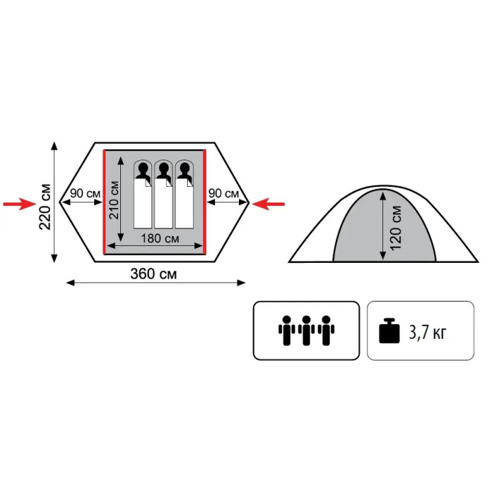 Тримісний туристичний намет TrampLite Erie 3 з двома симетричними входами та табурами.