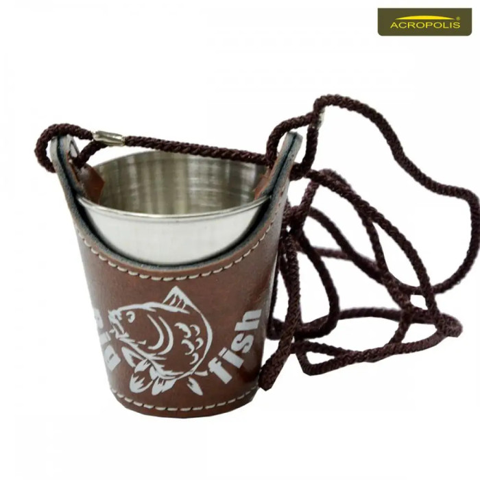 Матеріал чарки - нержавіюча сталь. Чарка сувенірна мала Акрополіс СХМ-1 в чохлі з штучної шкіри і ремінцем для транспортування. На чохлі напис "Big fish" оформленний тисненням.