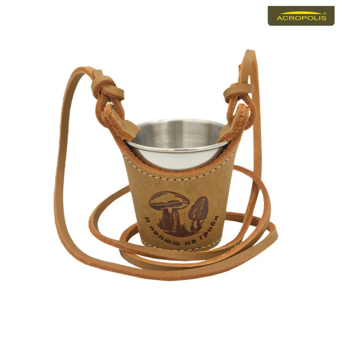 Невелика похідна склянка розроблена спеціально для грибників. Продається в чохлі з натуральної шкіри, який виконує функцію підстаканника та підвіски. Спереду сувенір оздоблений рельєфним тисненням з надписом "Я полюю на ...