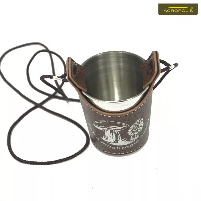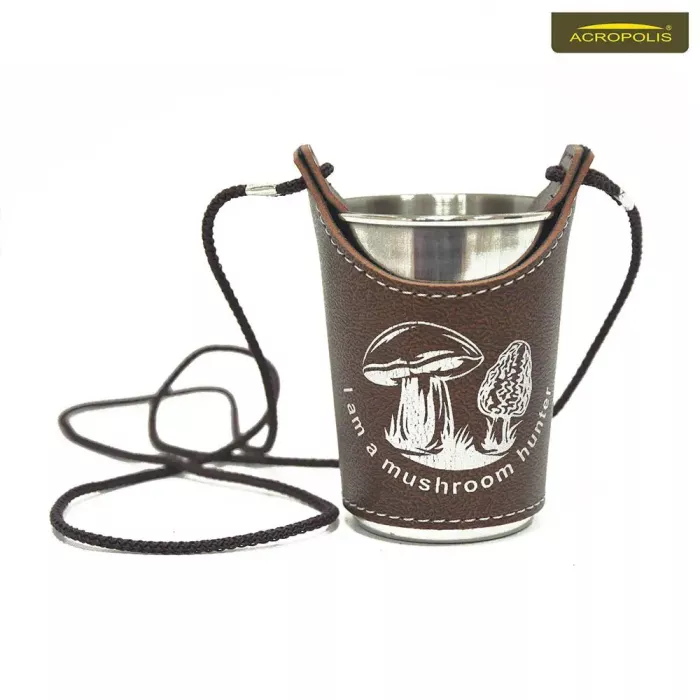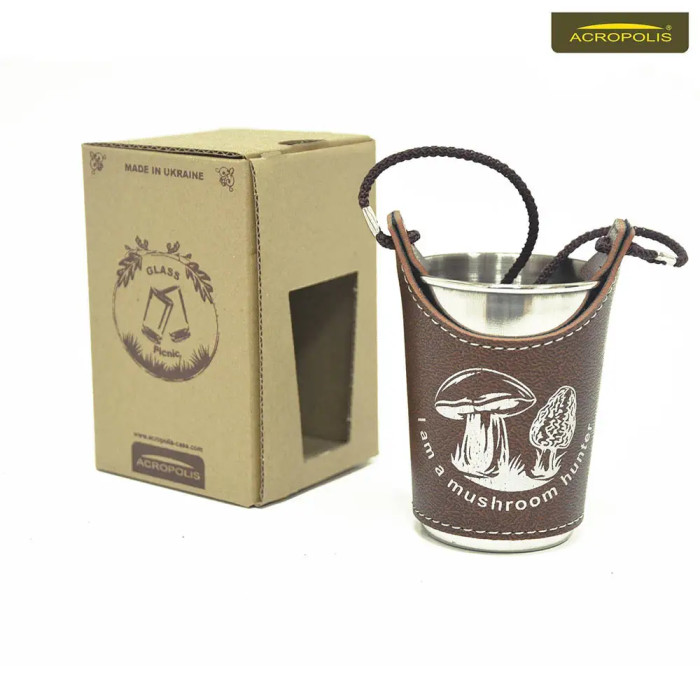 Похідна склянка розроблена спеціально для грибників. Продається в чохлі з штучної шкіри, який виконує функцію підстаканника та підвіски. Спереду сувенір оздоблений рельєфним тисненням з надписом «I am a mushroom hunter» Оригінальний подарунок для любителів "тихого полювання".