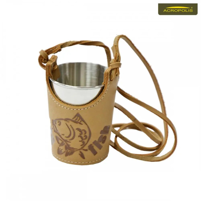Матеріал чарки - нержавіюча сталь. Чарка сувенірна мала Акрополіс СХБ-1 в чохлі з натуральної шкіри і ремінцем для транспортування. На чохлі напис "Big fish" оформленний тисненням.