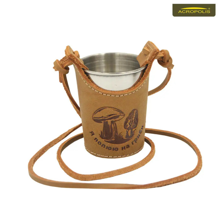 Невелика похідна склянка розроблена спеціально для грибників. Продається в чохлі з натуральної шкіри, який виконує функцію підстаканника та підвіски. Спереду сувенір оздоблений рельєфним тисненням з надписом "Я полюю на гриби". Оригінальний подарунок для любителів "тихого полювання".