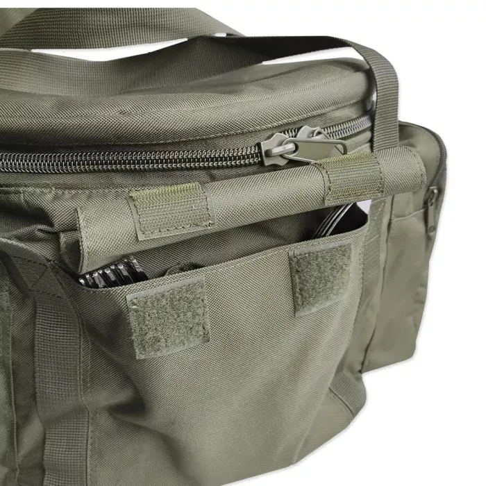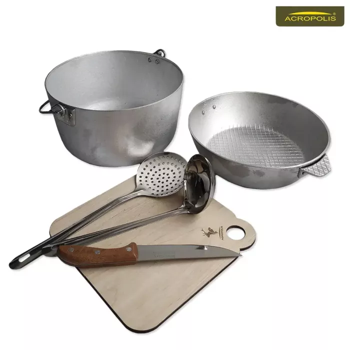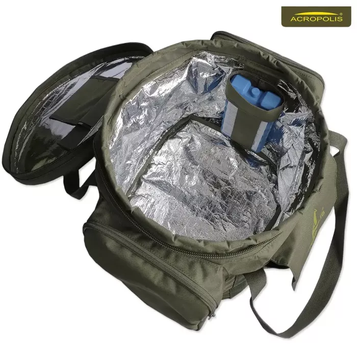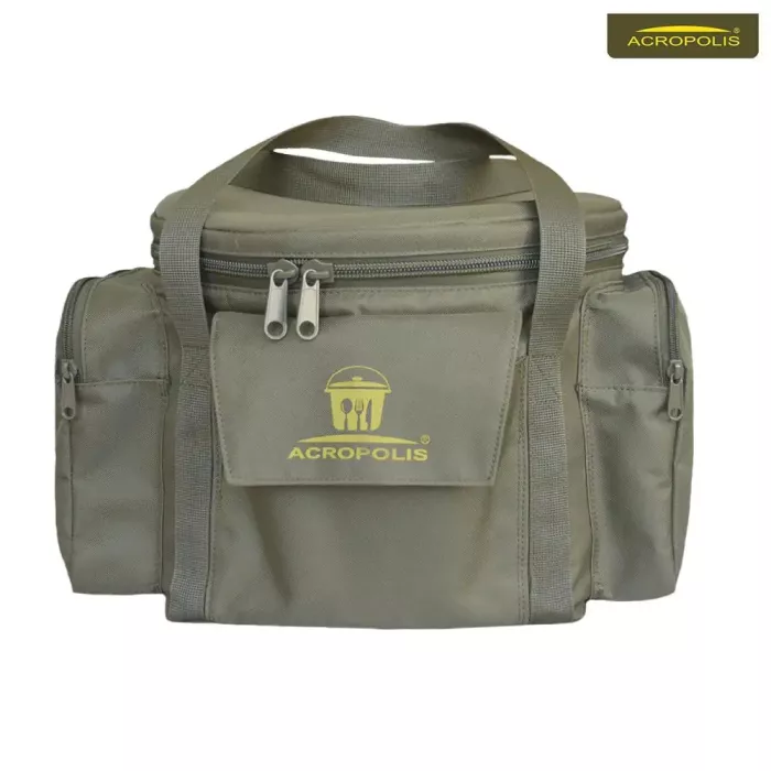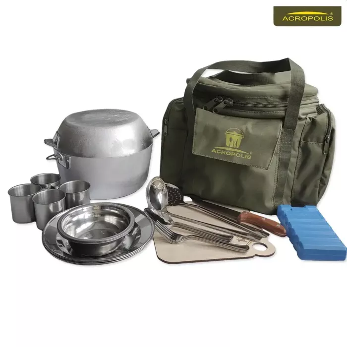 Горнятка, тарілки та столові прибори з нержавіючої сталі. Казанок для юшки та сковорода для смаження м’яса, риби чи овочів, виготовлені з жаростійкого алюмінієвого сплаву. Сумка з зносостійкого водовідштовхуючого матеріалу. В об’ємному термовідділенні лежить акумулятор холоду, казан, сковорода, дошка для нарізки, тарілки та миски. На природі сюди складають їжу, яка швидко псується в спеку або прохолодні напої, щоб вони не нагрівались. На відкидній кришці з внутрішньої сторони закріплені в 3-х комірках ножик, шумівка та ополоник. Зверніть увагу, комірка для ножа має спеціальний захист, щоб він її не пошкодив і не зісковзував вниз. Дві бічні кишені на блискавці призначені для горняток і кухонного приладдя, а в передню складають виделки та ложки. Сумка має укріплені стінки, 2 ручки для транспортування, що прошиті по усій довжині. Верхній металевий обідок вшитий в середині, робить комфортним процес складання і викладання кухонного посуду на риболовлі, пікніку чи полюванні. Сумка тримає форму та призначена для тривалого використання.