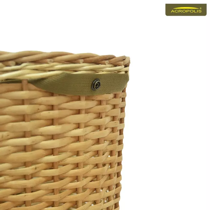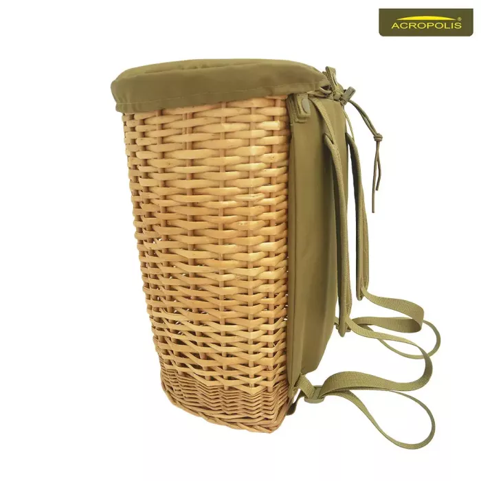 Базовим елементом виробу є плетений кошик з лози, який отримав багато схвальних відгуків в інших моделях грибних рюкзаків Акрополіс. Кошик плетений з віток різної товщини. Центральна частина має середнє плетення, а низ і дно укріплене щільним переплетенням вузьких і широких гілок. Це робить корзину міцною та легкою на вагу, забезпечуючи хороший доступ повітря в середину. Таким чином, гриби не запарюються і не чорніють, поки ви довезете їх додому.