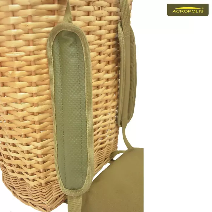 Об’єм кошика 13л оптимальної висоти та ширини. Спереду форма округла, а ззаду - пряма. Додаткова накладка з поліестеру та пінки нівелює неоднорідну поверхню кошика і лоза не тисне в спину.
