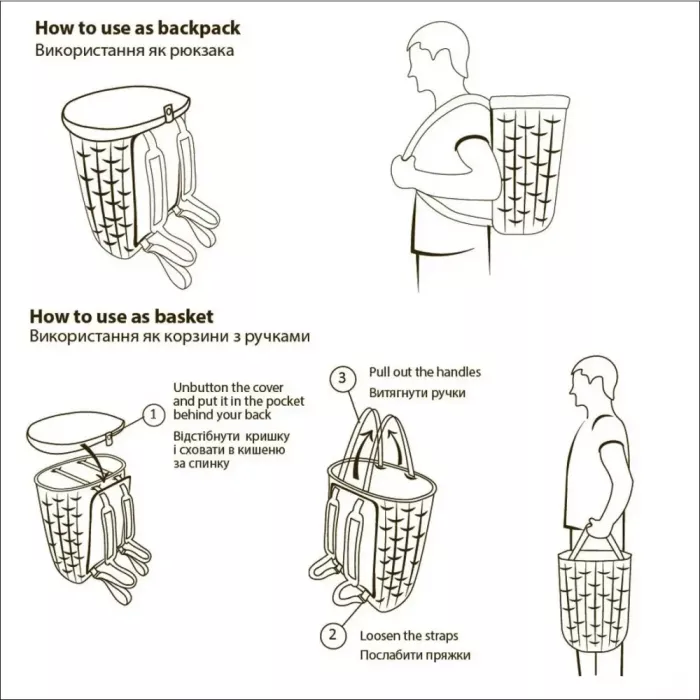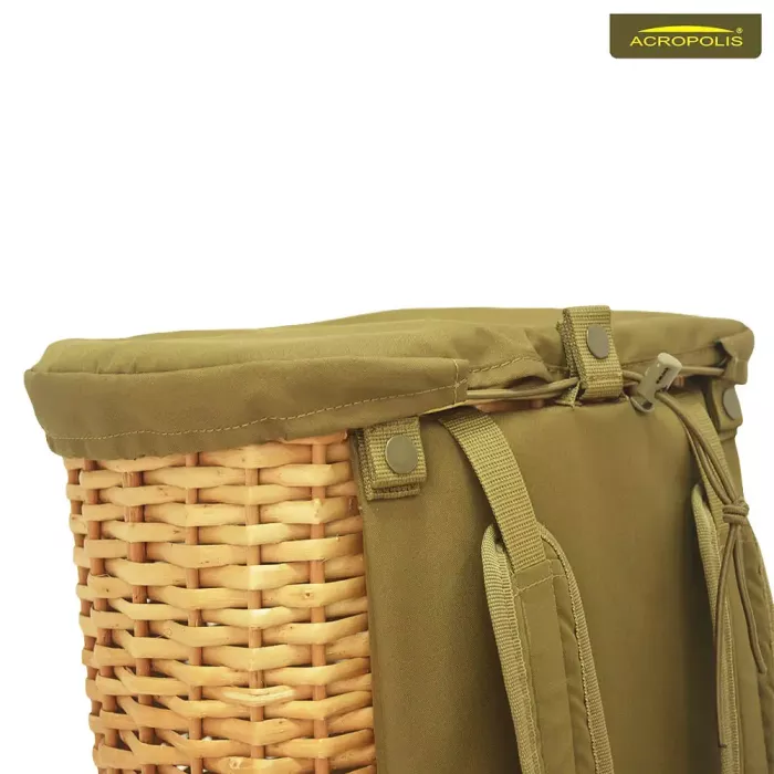 Кришка швидко знімається та одягається. Має дві системи фіксації до кошика. Спереду і ззаду – об’ємні кнопки з латуні, а по периметру еластичний шнур з додатковим фіксатором. Якщо ви хочете використати рюкзак як кошик, її можна зняти і скласти у внутрішню кишеню спинки. Так, вона не загубиться і не займає лишнього місця.