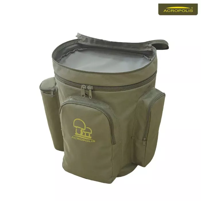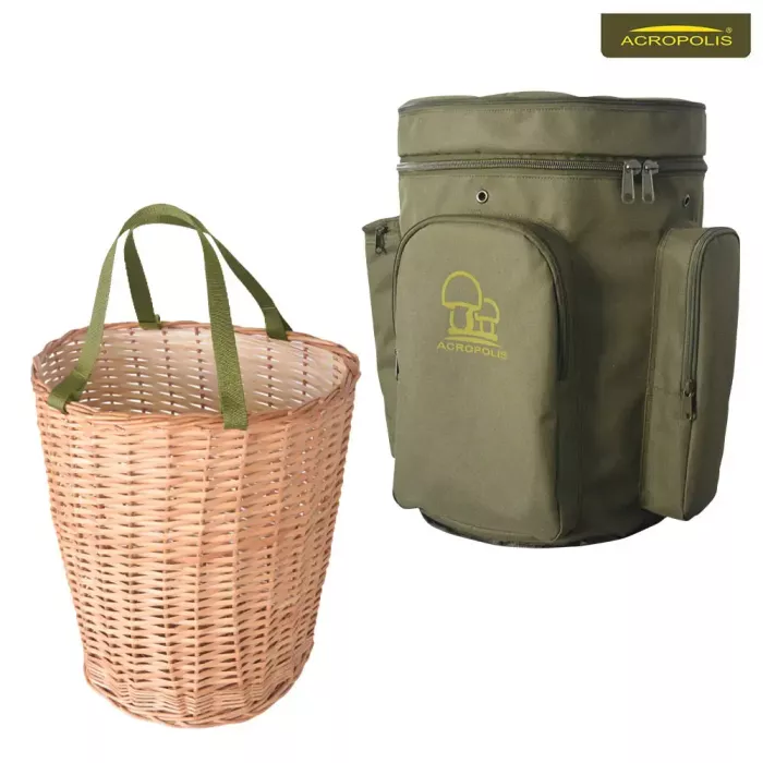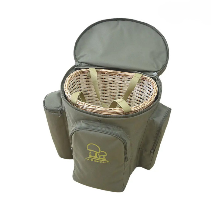 Рюкзак грибника з плетеним кошиком об’ємом 30л. Функціональний наплічник з водовідштовхуючого поліестеру: ергономічна спинка комфортна для спини; дві широкі плечові лямки мають стяжку на рівні грудей та регулюються по довжині; продумана система вентиляції для кращого зберігання грибів; дно рюкзака пошите з високоміцної сітки та ремінних строп; зверху пришиті 3 люверси для проходження повітря в середину виробу; з усіх боків - додаткові кишені (одна термокишеня, інші – в класичному виконанні); верхнє відділення на блискавці призначене для одягу чи інших особистих речей.